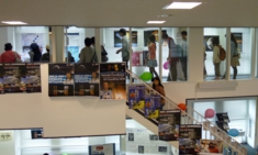 ・3階の回廊:金環日食のパネルを熱心に観る市民